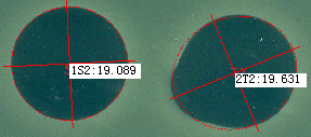 識別方式分成自動、橢圓、圓3種,橢圓是原有的識別方式,這種方式識別結果與抑菌圈邊緣貼合最好;圓是按抑菌圈最圓部分來識別,對不太圓的抑菌圈識別效果好;自動是兩者的綜合。3種方式識別出來的結果略有差異,具體見下面圖像。
