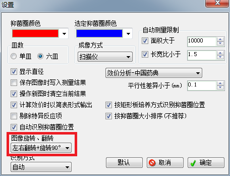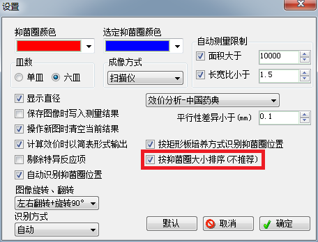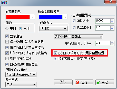 1、 按平板識別:如圖1紅框所示,選上【按平板培養方式識別抑菌圈位置】時,系統將會按平板方式識別抑菌圈位置(每列必須4個抑菌圈,且4個抑菌圈基本在一直線上,否則無法識別),如圖2所示。